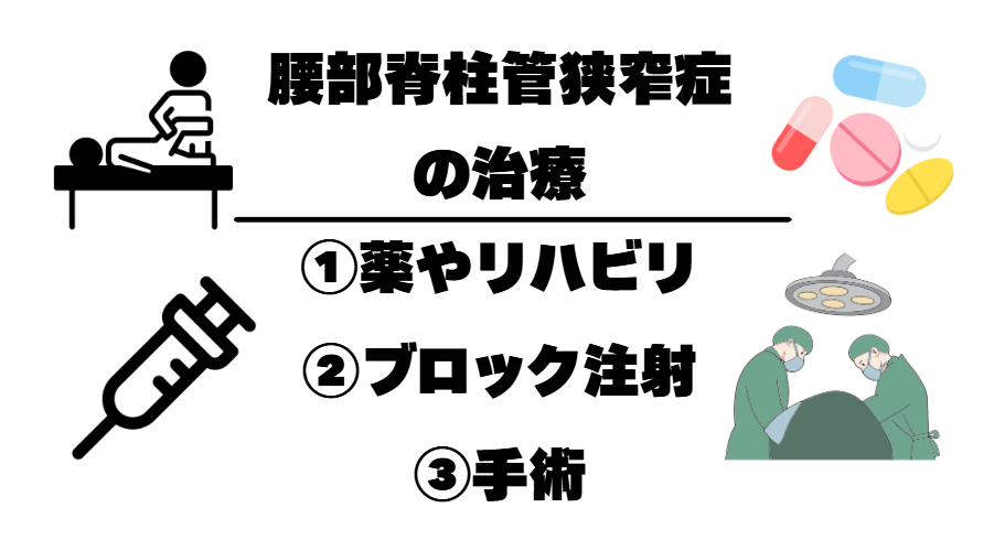 腰部脊柱管狭窄症の治療は以下のようになります。薬、注射やリハビリでも症状が改善せず、生活に支障がでるような状態であれば手術を考えます
