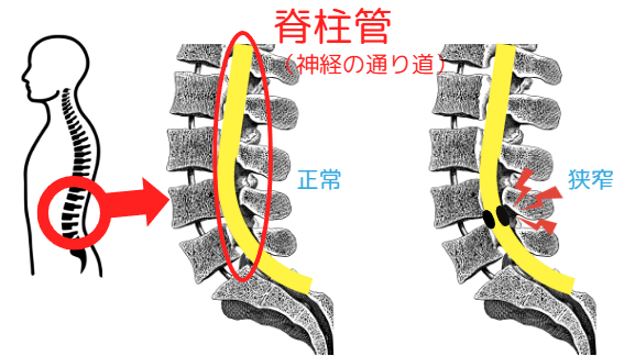 狭窄は、加齢に伴い椎間板、骨、靭帯が変形してしまうことで起こります。